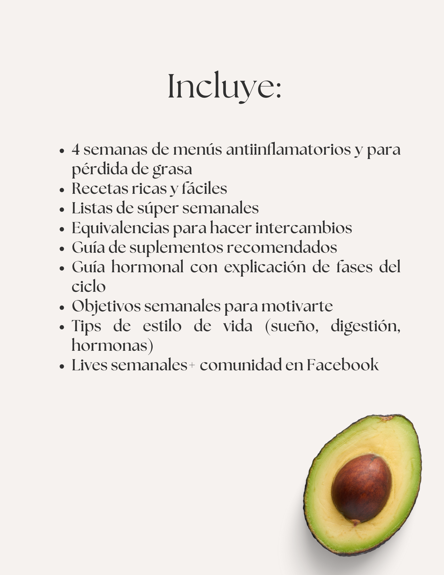 Un programa integral de 4 semanas que combina lo mejor de Inner Reset (alimentación antiinflamatoria) y Glow It Up (pérdida de grasa) para ayudarte a: